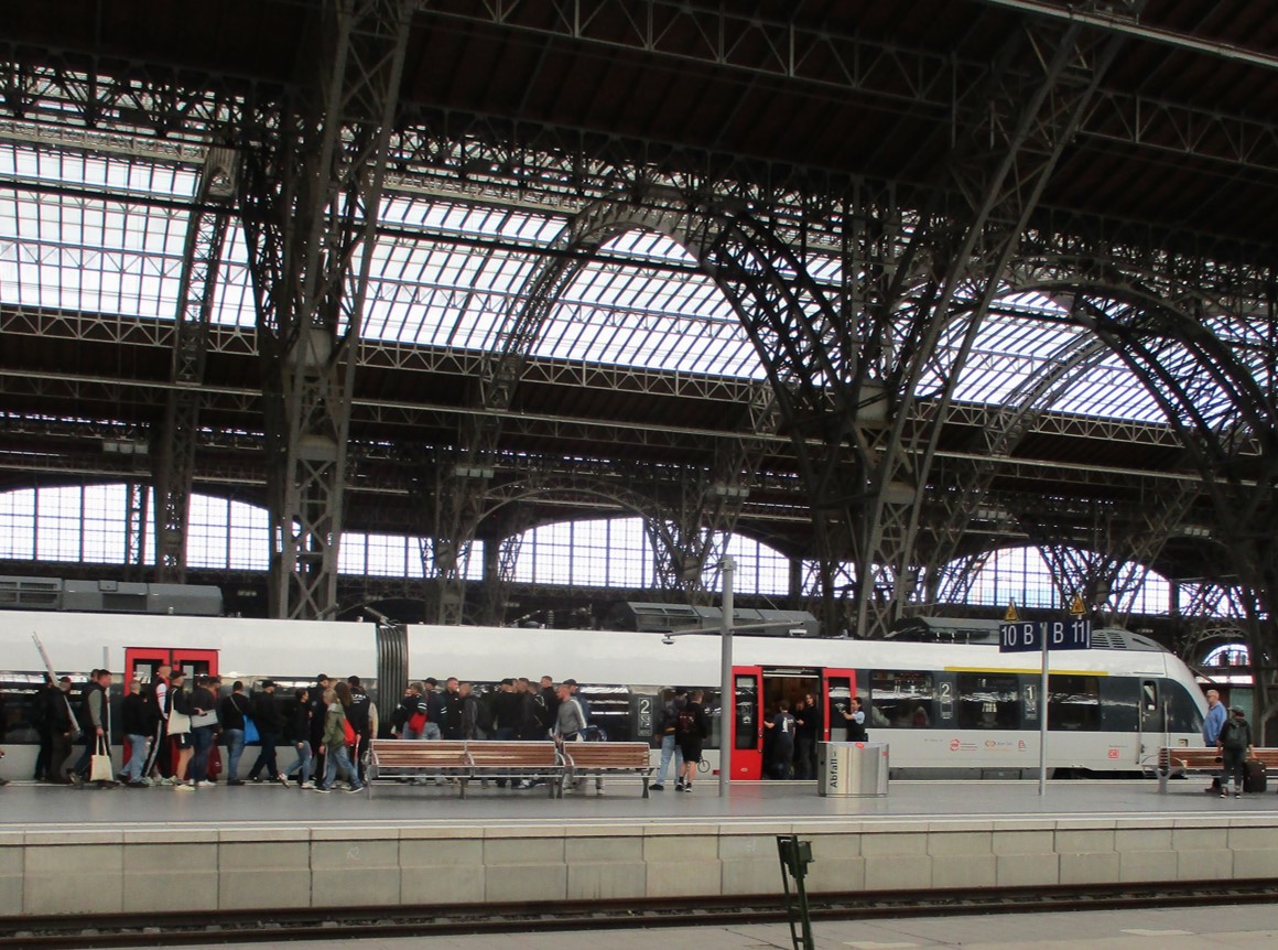 Beim einzig Zug-besetzten Gleis (Regio, der Zug ist schon voll) kommt auch was auf – Polizei begleitet Fan-Gruppen gen Fußball, bekommt sie verstaut.