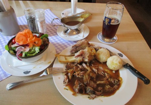 Mein örtliches Lieblingsessen, präpariert – Haxe mit Schwarzbiersauce, Knödeln und schickem, buntem Salat.