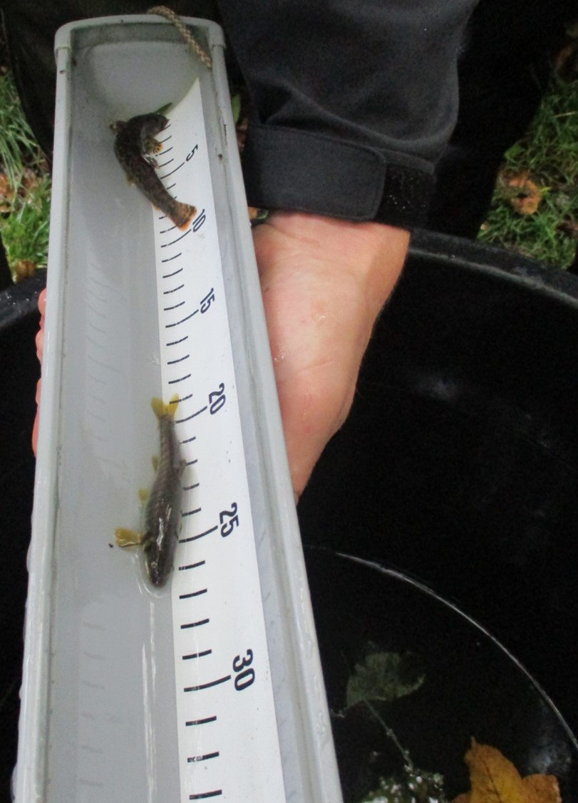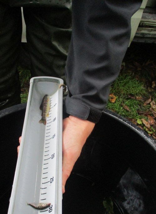 Bachforellen vermessen – – kann bei ungeduldigem Fisch schwierig sein. Gelegentlich springt schonmal einer in den unten stehenden Bottich mit den bereits vermessenen – geschätzter Eintrag folgt.