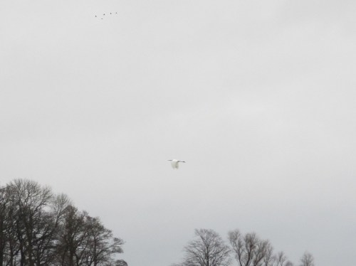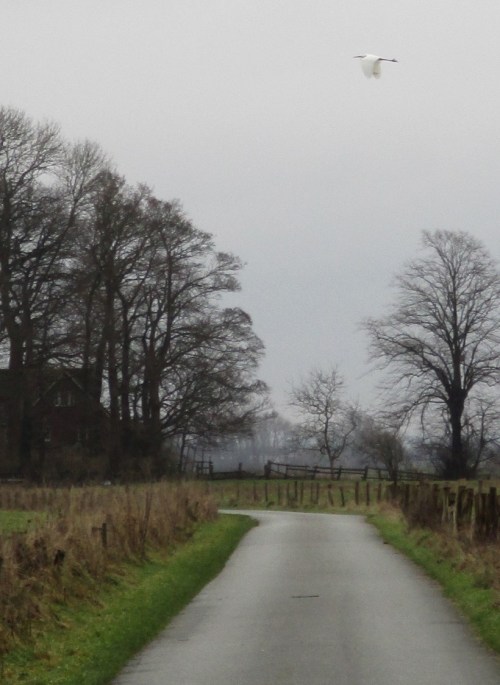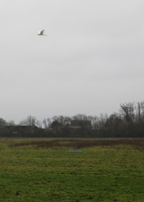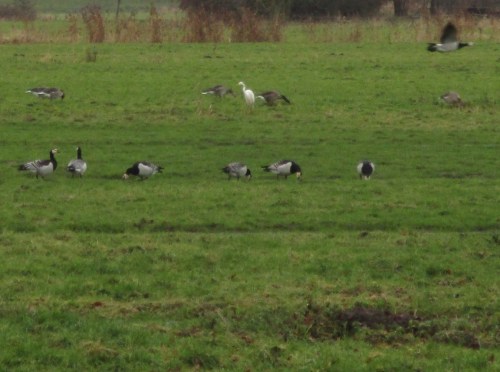 Ich habe den Pferdehof durchradelt. Dies könnte „mein“ Reiher sein, nun zwischen Grau- und Nonnengänsen.