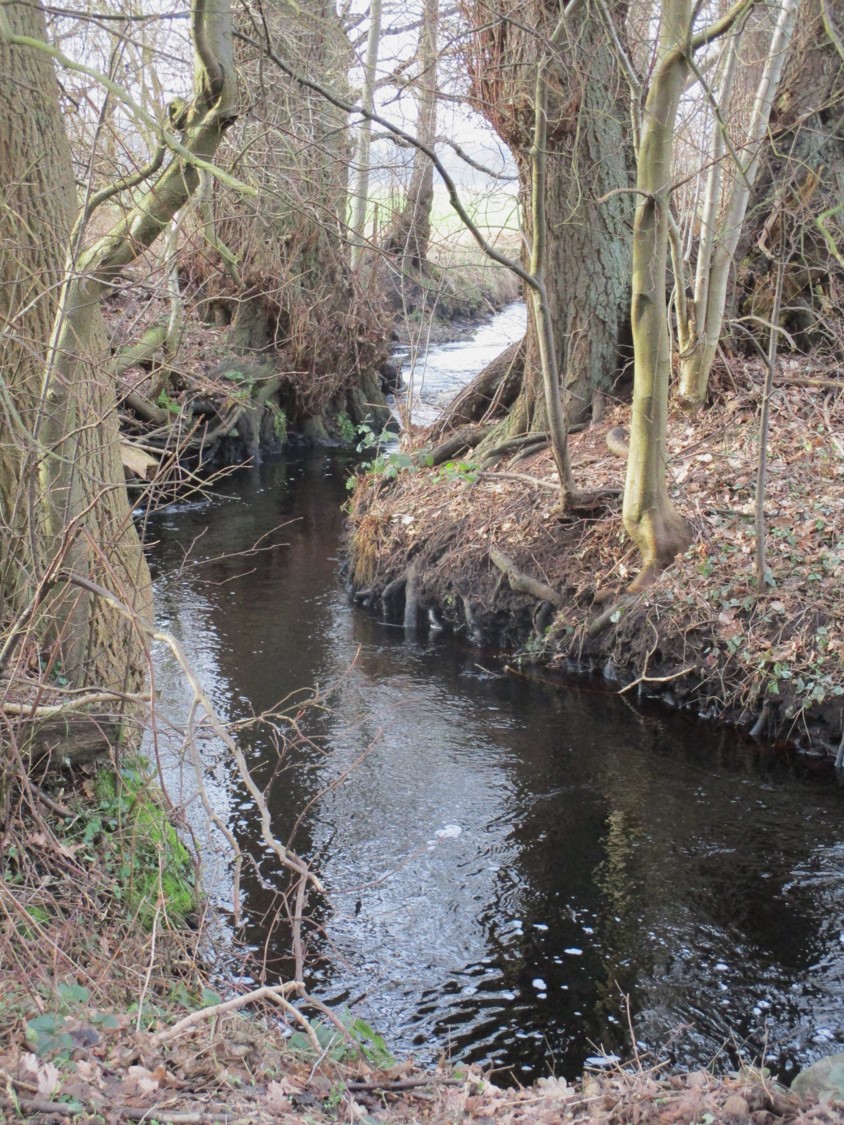 Fast bordvoll, pottschwarz, hier punktuell schön mit Erlen gesäumt – Zulauf aus dem Himmelmoor Richtung Bilsbek.