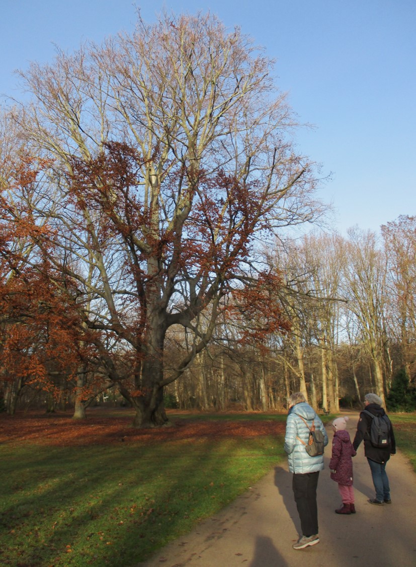 Typisch „Tiergarten“ – Einzelbuchen und -eichen bieten mit ihren Früchten reichlich winterliche Nahrung.