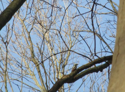 Was mit dem Kleiber fehlschlug, klappt mit dem Specht – da sitzt er (der ansonsten eifrig die Äste und Baumstämme umrundend aktiv ist).