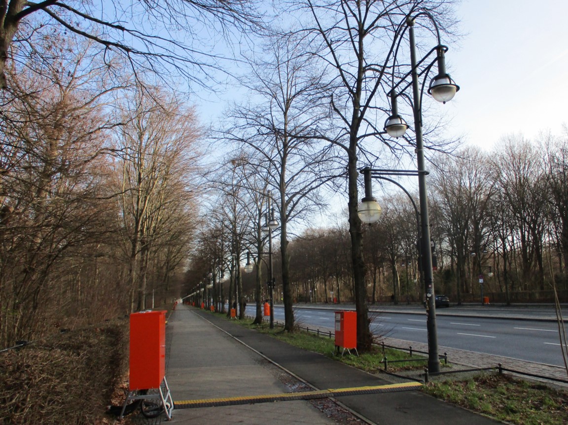 Blick Richtung Brandenburger Tor – wir vermuten mal, dass die roten Teile Stromversorgungen für noch einzurichtende Verkaufsstände sind.