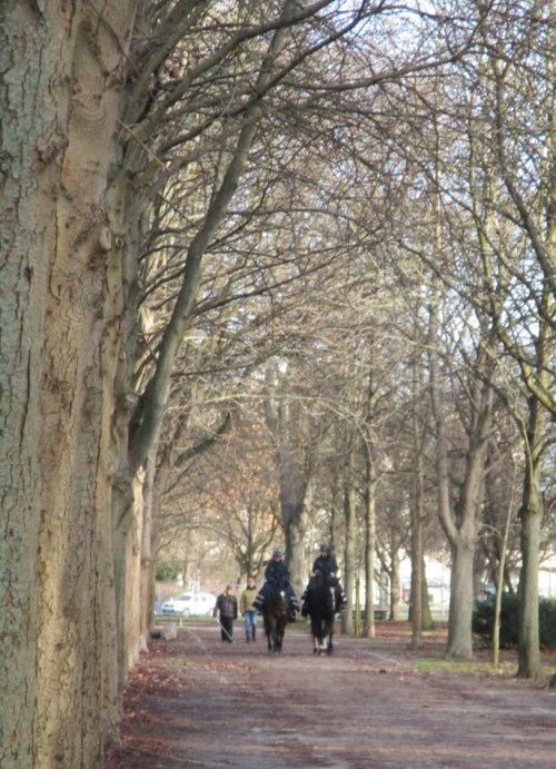 Damit alles mit rechten Dingen zugeht, wird der Tierpark mit berittener Polizei überwacht. – „Moin.“