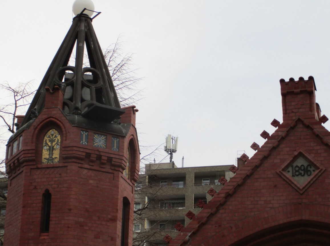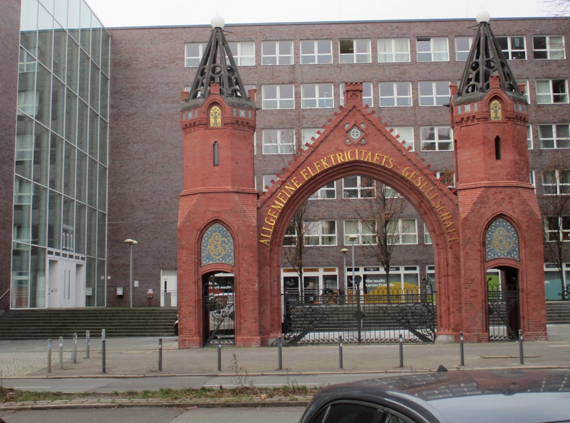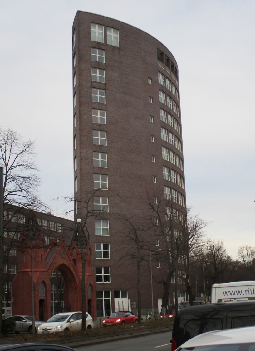 Ich bin mit der Tram zur Bernauer Straße gefahren und gehe die Brunnenstraße gen Norden. Bauliche Besonderheit am Ziel: Das „Beamtentor“ und ein Hochhaus mit spitzigem Oval-Grundriss.
