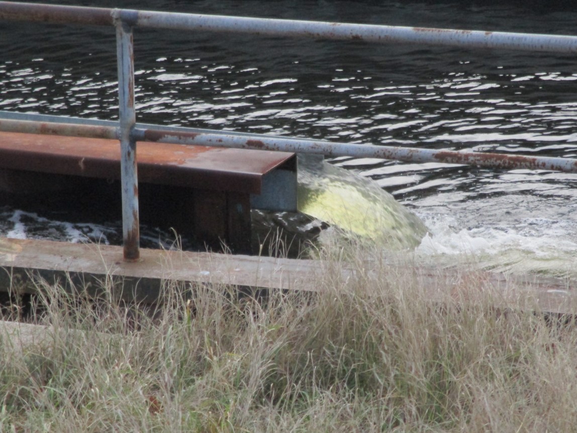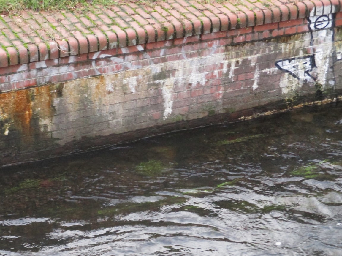 Hoch fliesst das Wasser der Panke Richtung Nordhafen ab. Die Turbulenz und in der Strecke Windungen erzeugenden Gabionen sind nur an fleckenhaftem Hellgrün, dem Wasserstern, zu erkennen.