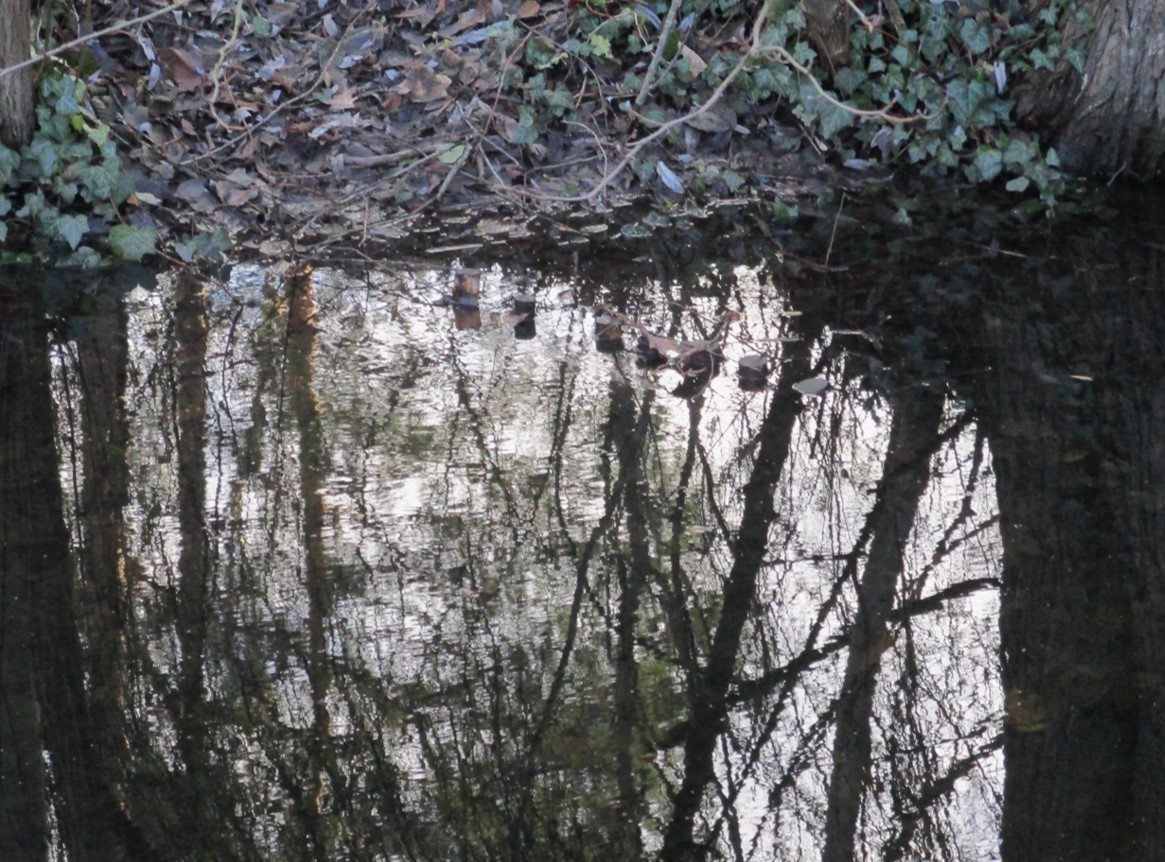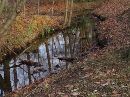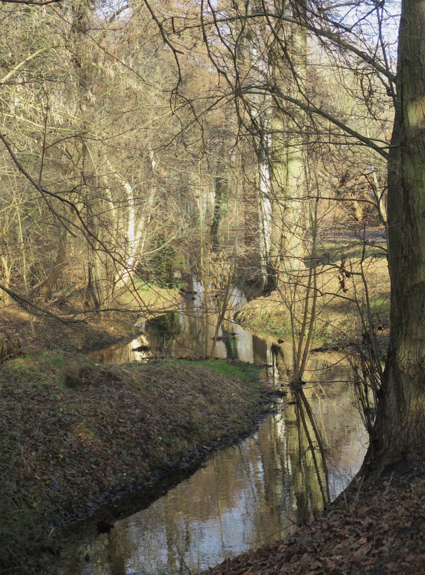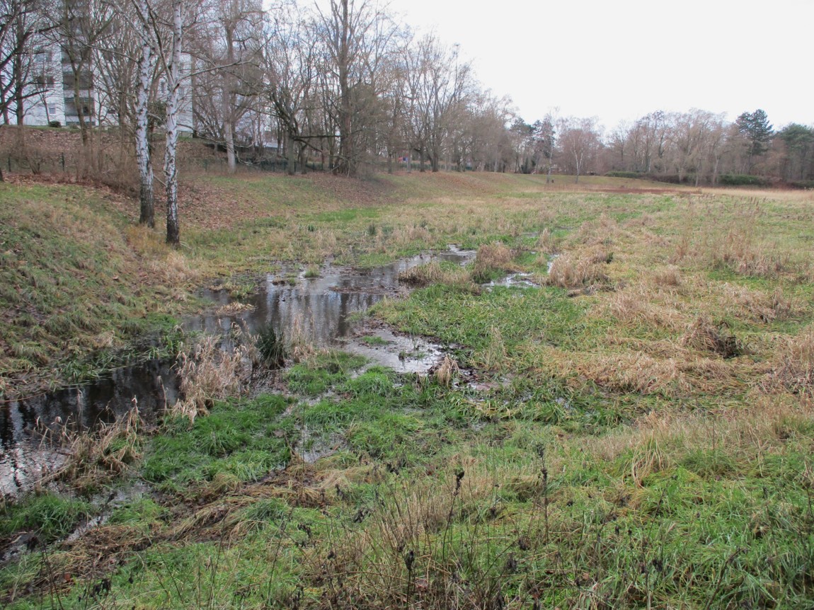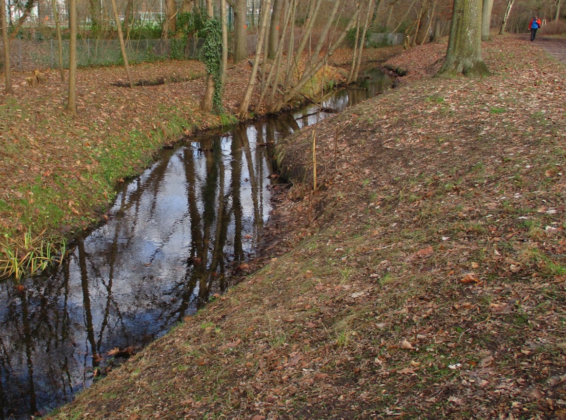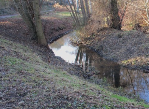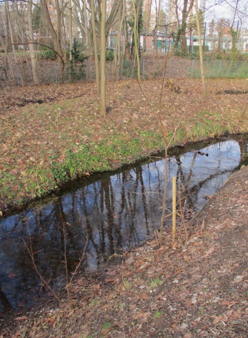 Bewuchs und Dreidimensionalität des Bewuchses zeigen, dass neben Müllentfernung hier schonende Gewässerunterhaltung praktiziert wird. So kann sich, mitten in der Stadtumgebung, eine ökologische Perle entwickeln (Ähnliches befindet sich auch an den im vorigen Beitrag im Zusammenhang mit dem Stichwort Uferbeschaffenheit beschriebenen Stadtbächen in Entwicklung).