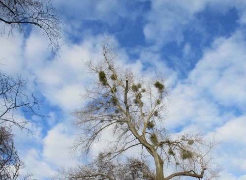Hoch über uns zahlreiche Misteln – hoffentlich hält der Stamm Stürmen aus jeglicher Himmelsrichtung noch Jahre stand.