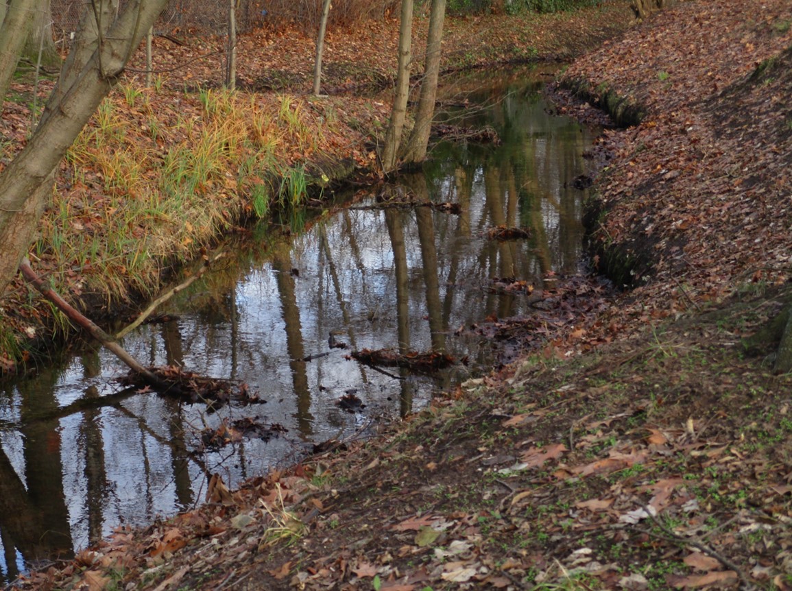 Letzter Blick in die Strecke bachauf: Rauigkeit durch Äste und Blattansammlungen, das Wasser fliesst gleichwohl ungehindert ab – Lehrstück für die Unterhaltung.