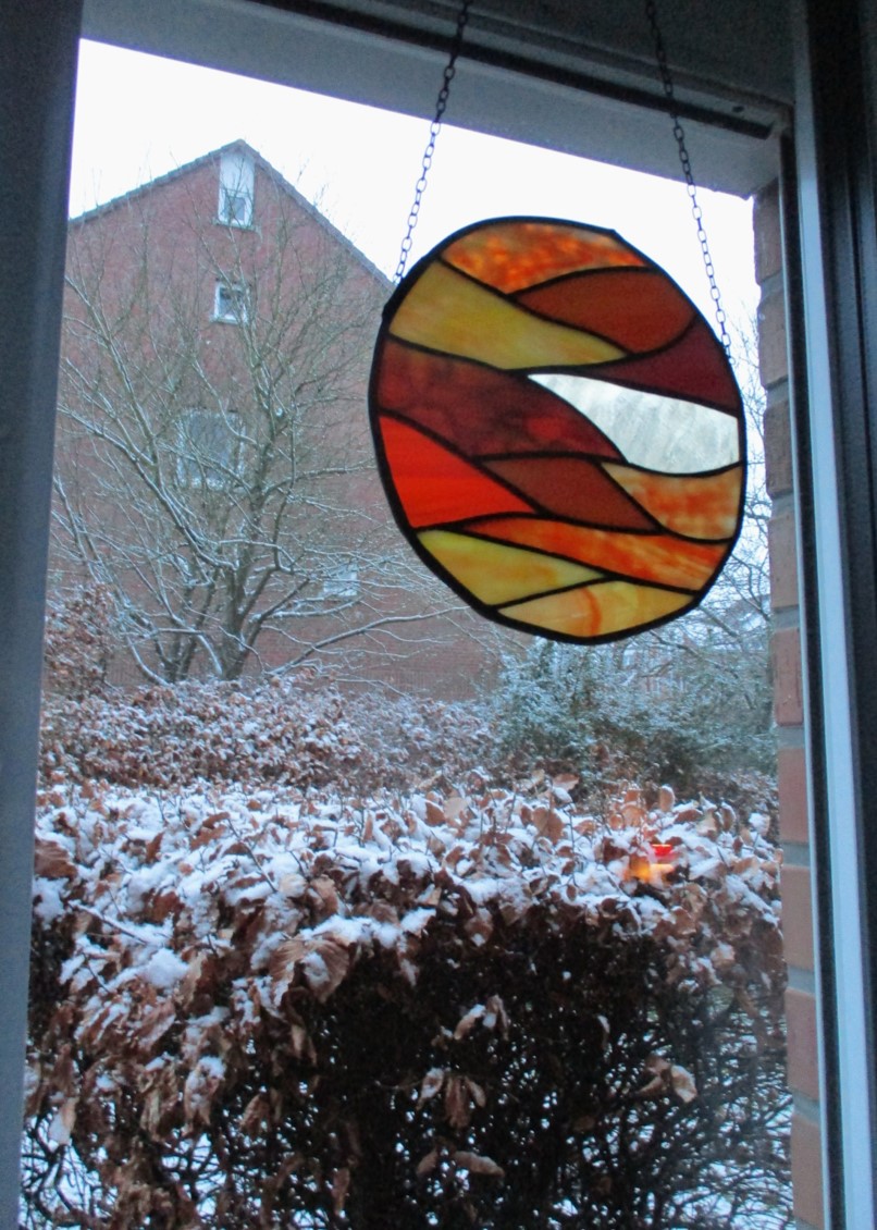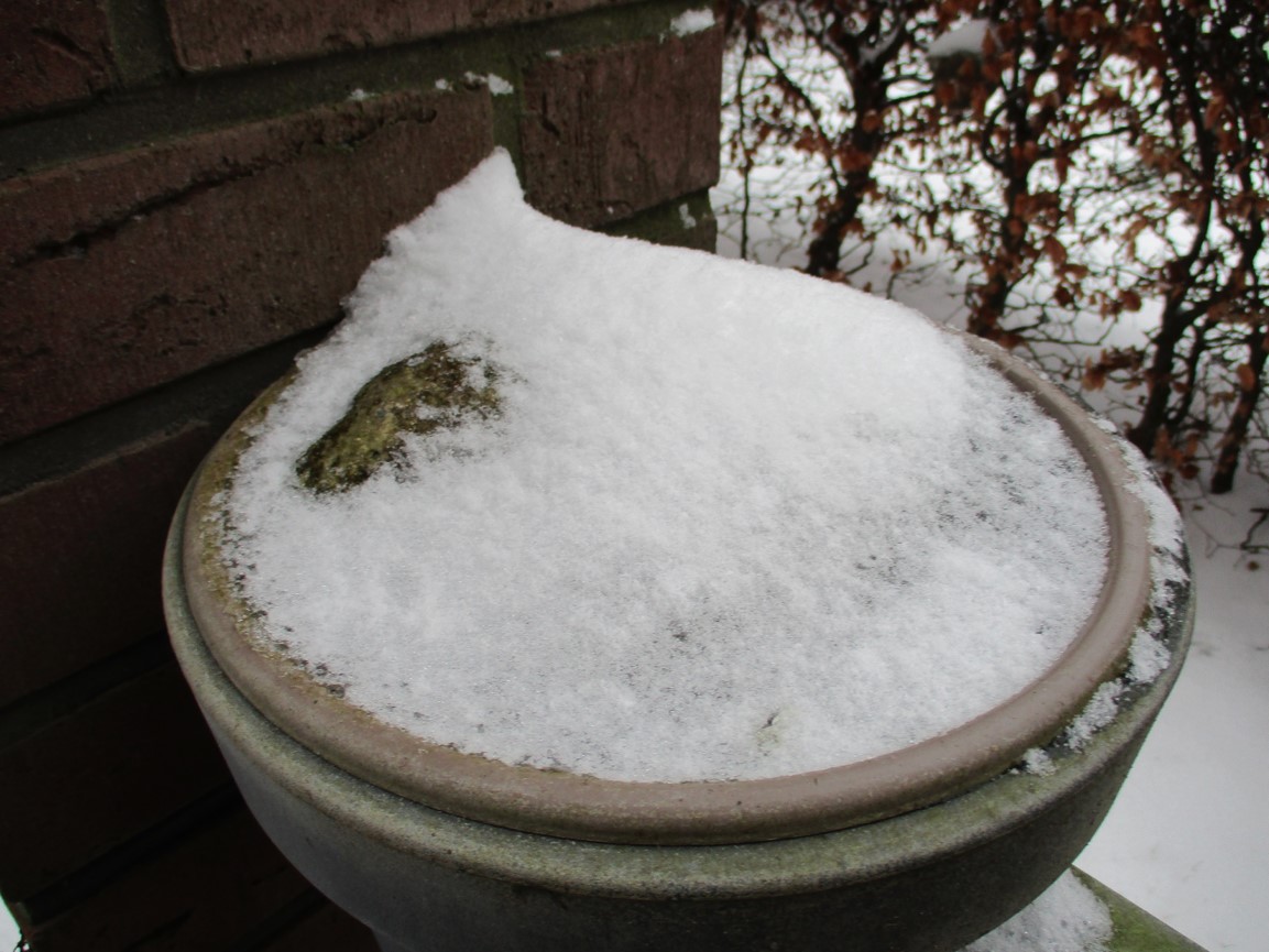 Das Vogelbad ist tags drauf durchgefroren, mit etwas verstärkter Kleinstschneewehe bedeckt.
