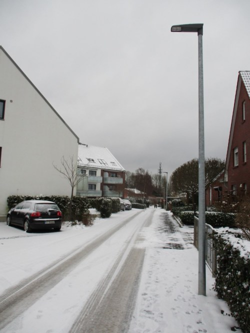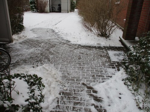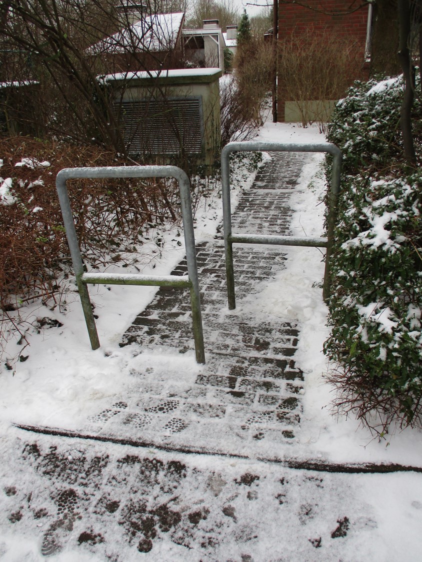 Den und unseren Hauseingang hatte ich vor dem kleinen Rundgang oberflächlich geräumt. Später wird der beauftragte Gärtner ringsum begehbare Wege insgesamt geräumt und gestreut haben.