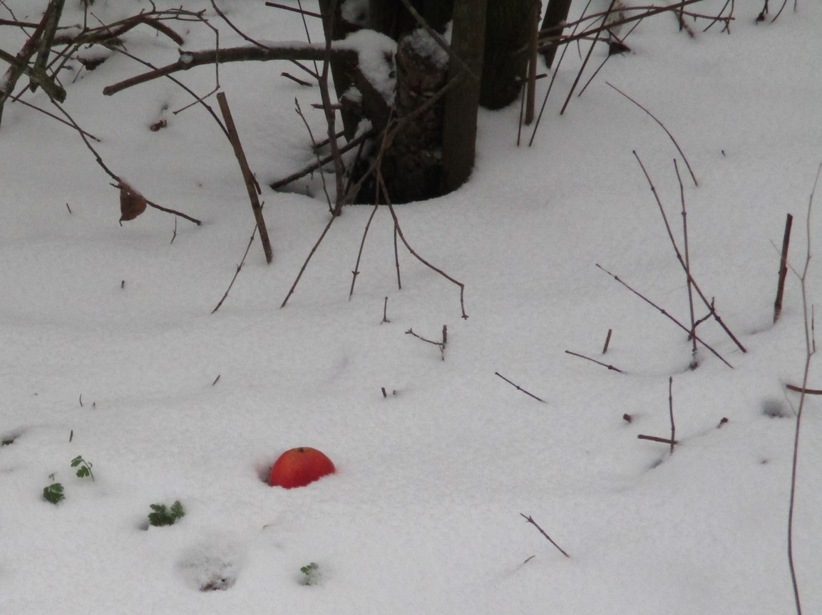 Rot leuchtet der Apfel für die Vögel im Schnee.