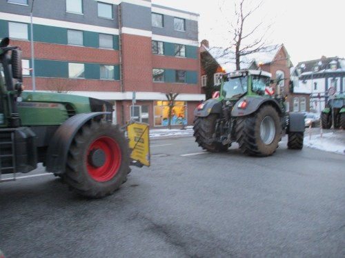 Da gibt`s was zu erleben. Röhrend bewegen (hoffentlich) Führerscheinbesitzende XXL- und kleinere landwirtschaftliche Fahrzeuge vom Treff in Hamburg in heimische Gefilde zurück. In der hiesigen Innenstadt-Tempo-30-Zone der Bundesstraße („Lärmschutz“!) komme ich mir angesichts begleitenden Fanfaren-Gedröhns fehl am Platze vor.