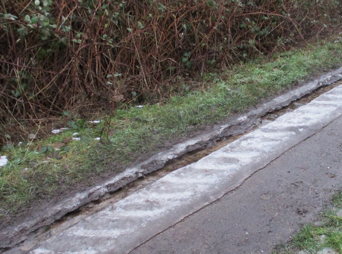 Kleinklima – hier lag offenbar eine dicke, von der hangseitigen Fahrspur verdrängte Schneewurst. Als Eisstrang verblieben, von Tauwasser durchschnitten, taut sie nun vor sich hin.