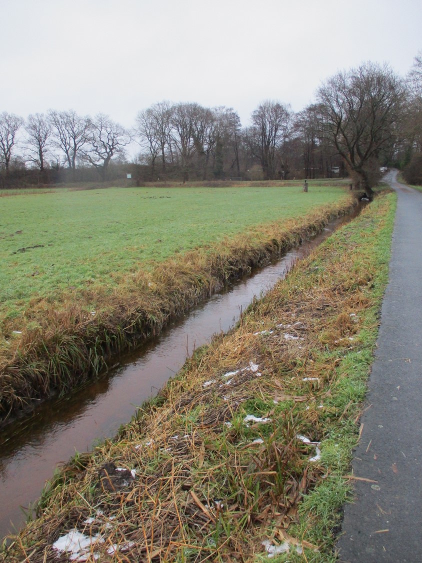 Blick S, nasser – der Weg Am Hang führt, etwas höher liegend als die Marsch, unten am Geesthang längs.
