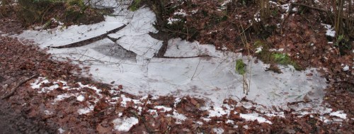 Oben, on top, auf der Geestkante zeigt ein baumbestandener Grabenrest jüngste Geschichte: vollgestaute Mulde, zugefroren. Mit höheren Temperaturen versickerte das Volumen, das Eis brach. Nun taut es munter drauflos.