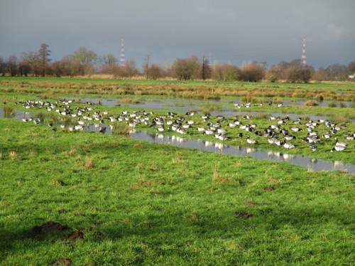 Dichter dran – ein Schwarm Nonnengänse beim Frühstück. Am Horizont rast Schwarzes auf der Route Hetlingen – Holm.