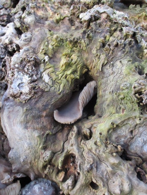 Aus dem „Wurzelholz“ (falscher Ausdruck, vgl. Link oben „Maserknolle“) guckt hier und da ein Entkommener heraus.