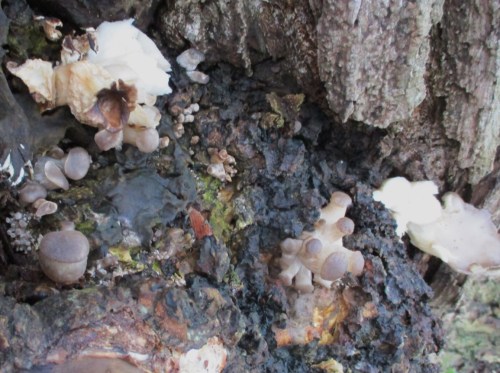 Langer Damm, Pappelreihe – wo seit Jahren eine große Maserknolle zu betrachten war, die zwischendrin zusammenschrumpfte, wachsen nun Pilze, groß.