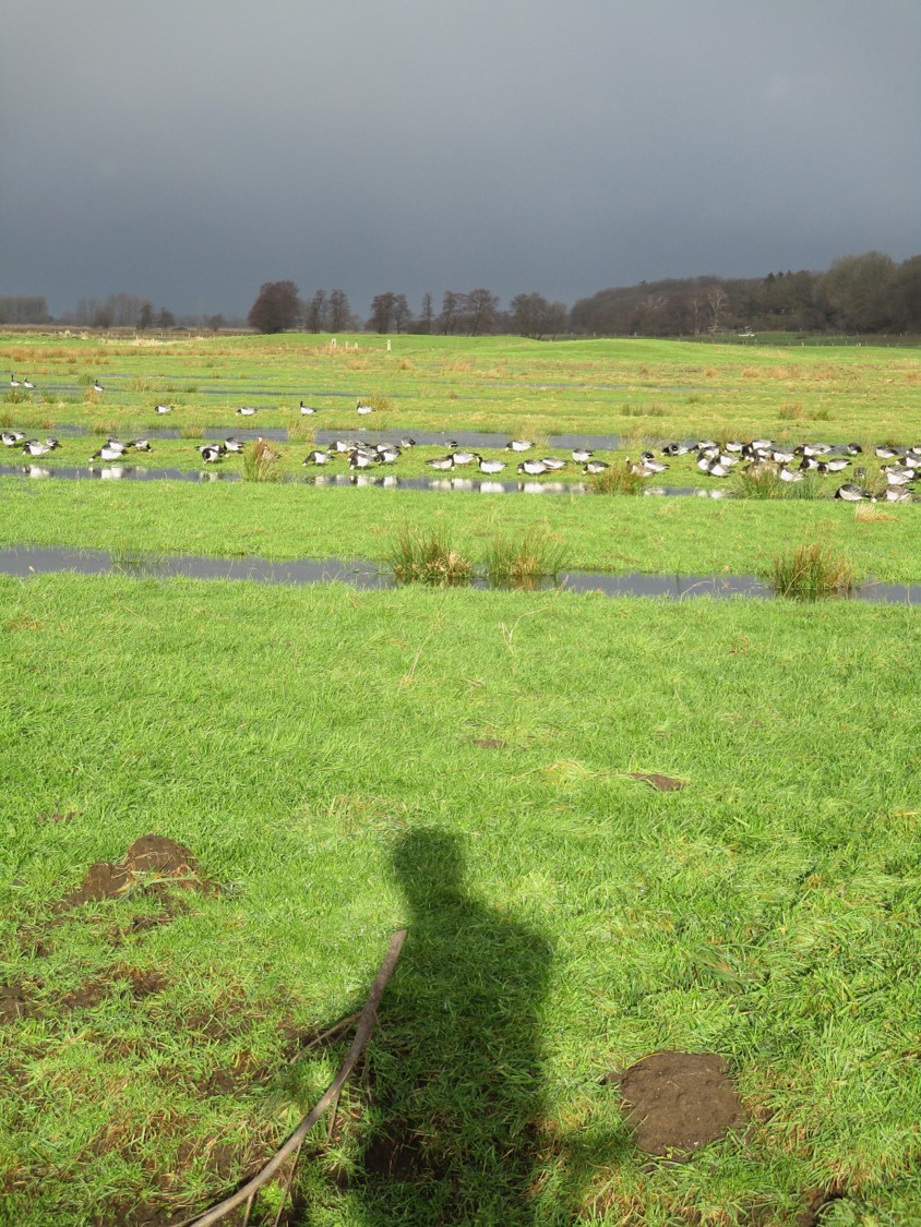 Dichter dran – ein Schwarm Nonnengänse beim Frühstück. Am Horizont rast Schwarzes auf der Route Hetlingen – Holm.