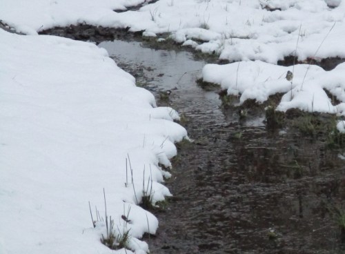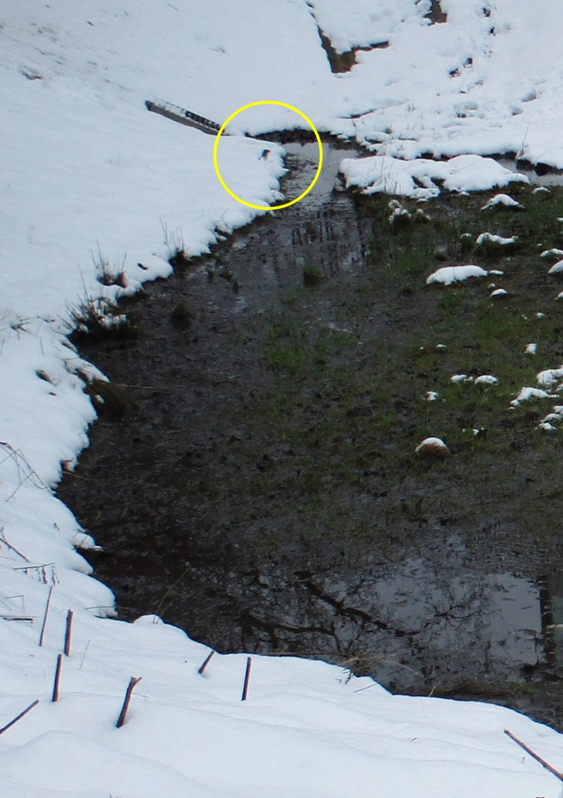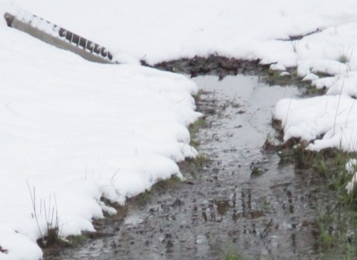 Über den gut beschneiten Regenwasserweg Wedels bin ich am Regenrückhaltebecken angekommen. Hinten, am Ablauf, war mir Bewegung aufgefallen.