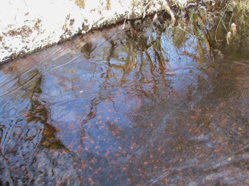 Bislang konnte ich angesichts des erhöhten Abflusses die Gewässersohle nirgends sehen. Hier sind nun die Laichaktivitäten von Forellen im Kies schwach erkennbar.