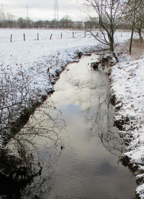 Beim Fotografieren hatte ich mich auf die weisse Wiesenfläche konzentriert. Lange Zeit war hier die Offenau großflächig über die Ufer getreten. Diese tiefliegende Fläche bewahrt, wie die Krückauwiesen, Elmshorn vor Überschwemmung. – Zunehmend lernen Städte, welchen Wert erhaltene Überschwemmungsgebiete darstellen.