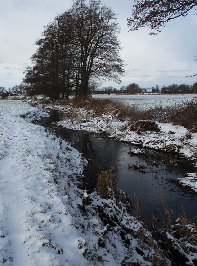 Beim Fotografieren hatte ich mich auf die weisse Wiesenfläche konzentriert. Lange Zeit war hier die Offenau großflächig über die Ufer getreten. Diese tiefliegende Fläche bewahrt, wie die Krückauwiesen, Elmshorn vor Überschwemmung. – Zunehmend lernen Städte, welchen Wert erhaltene Überschwemmungsgebiete darstellen.
