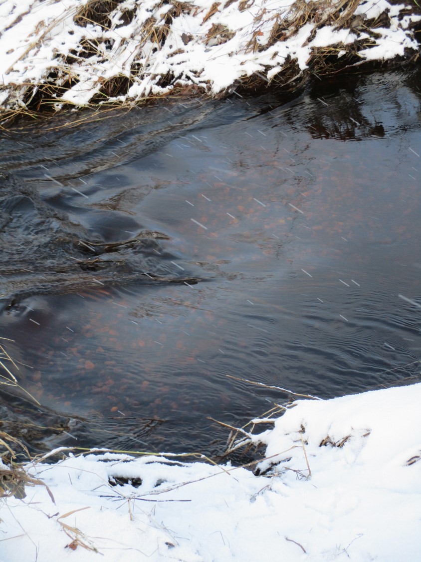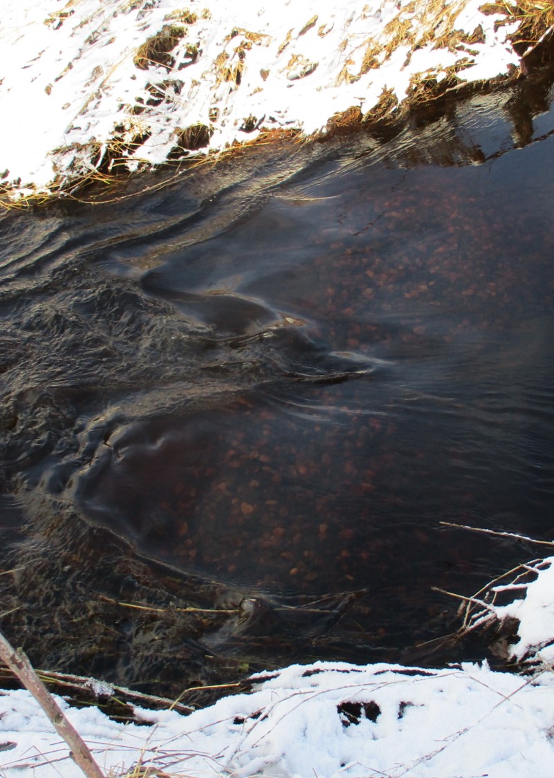 Bislang konnte ich angesichts des erhöhten Abflusses die Gewässersohle nirgends sehen. Hier sind nun die Laichaktivitäten von Forellen im Kies schwach erkennbar.