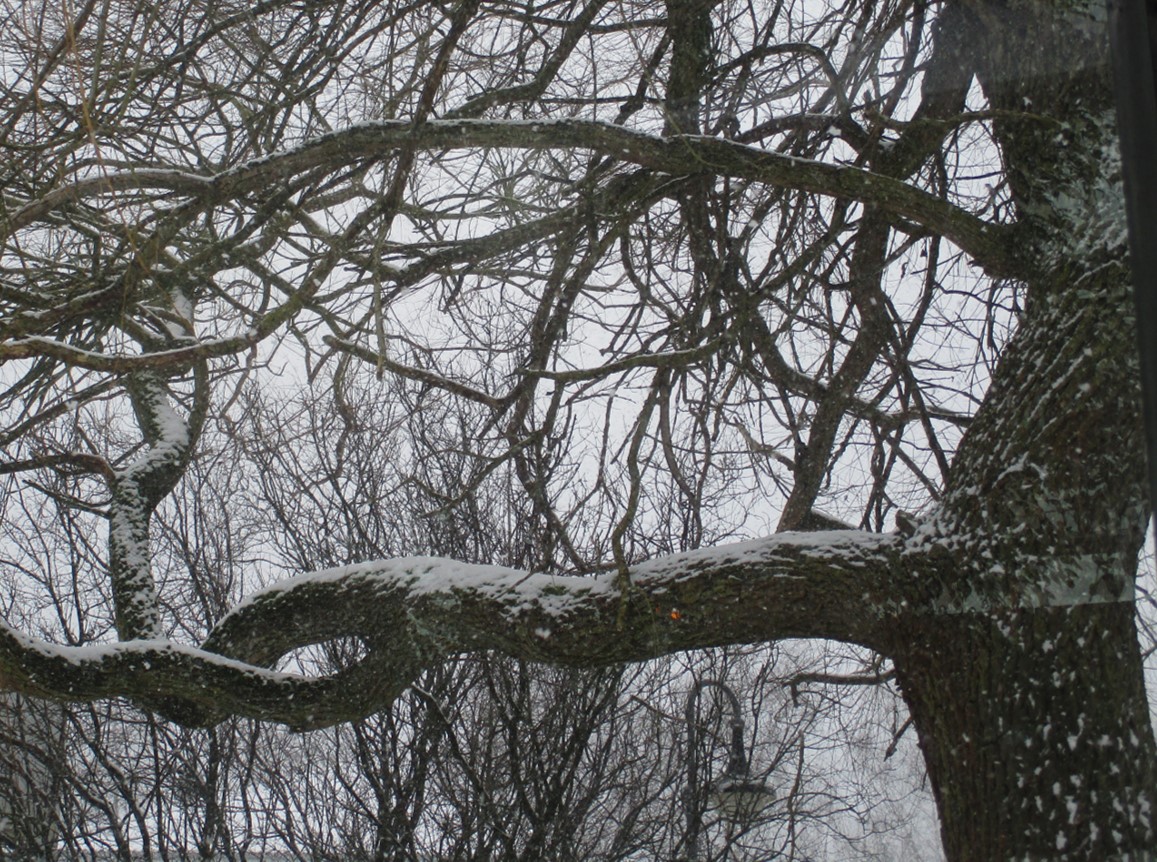 Das Auto geparkt, Schneetreiben fotografiert … – erst auf dem Foto sehe ich den Schwarm Saatkrähen im Baum sitzen.