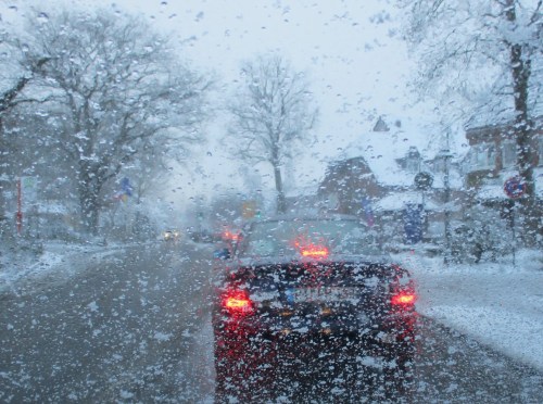 Das Auto geparkt, Schneetreiben fotografiert … – erst auf dem Foto sehe ich den Schwarm Saatkrähen im Baum sitzen.