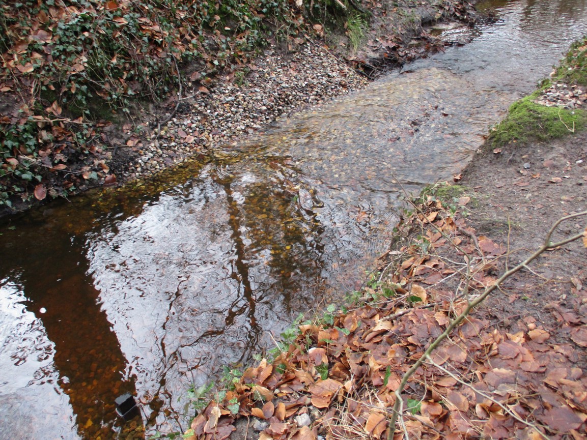 Tatsächlich – Meerforellen fanden bei hohem Abfluss bis hierher, schlugen eine Laichgrube. Bachab liegt, Turbulenz erzeugend der kleine Kiesberg mit den Eiern drin.