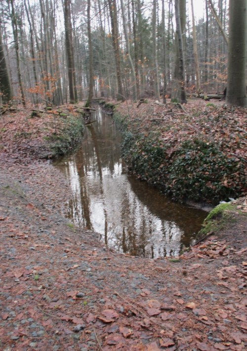 In der Kanalstrecke – „die Natur“ habe ich passiert, liegt bachauf. Am Ufer gegenüber mündet, tief, ein lang mäandrierender, höher liegender Lauf. Vielleicht handelt es sich um den ursprünglichen Bachlauf.