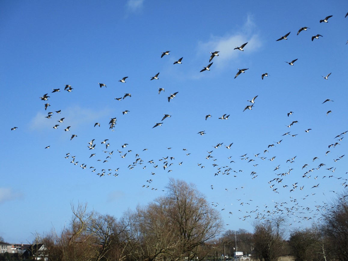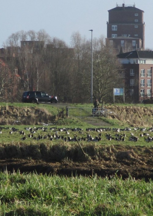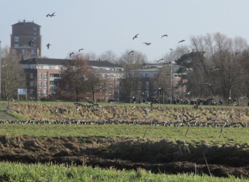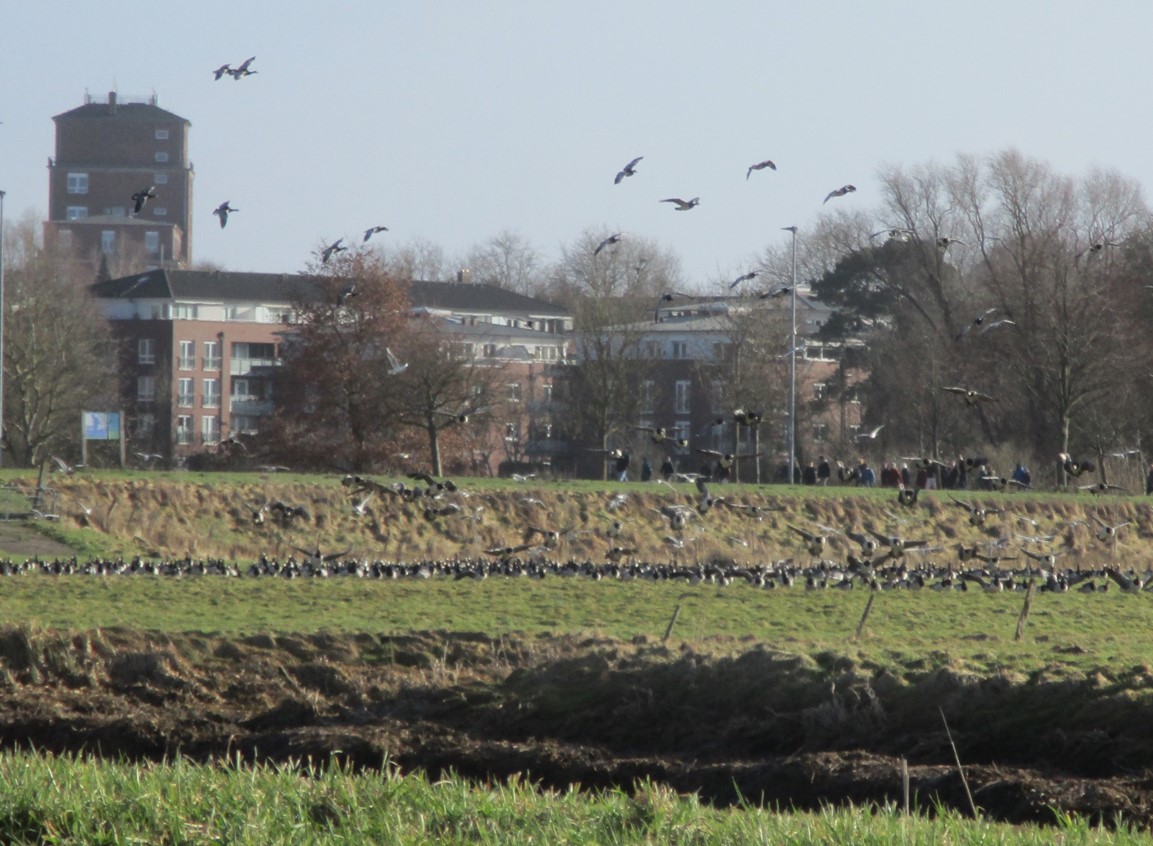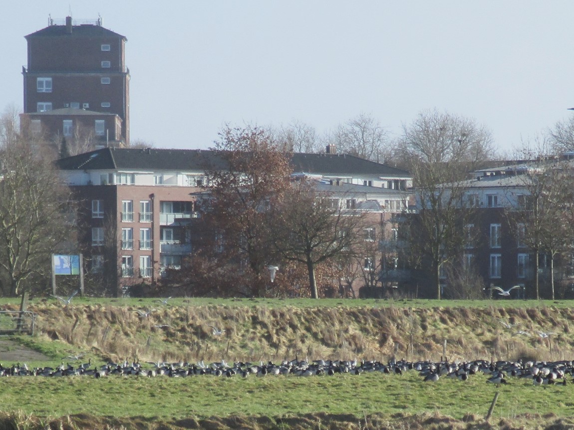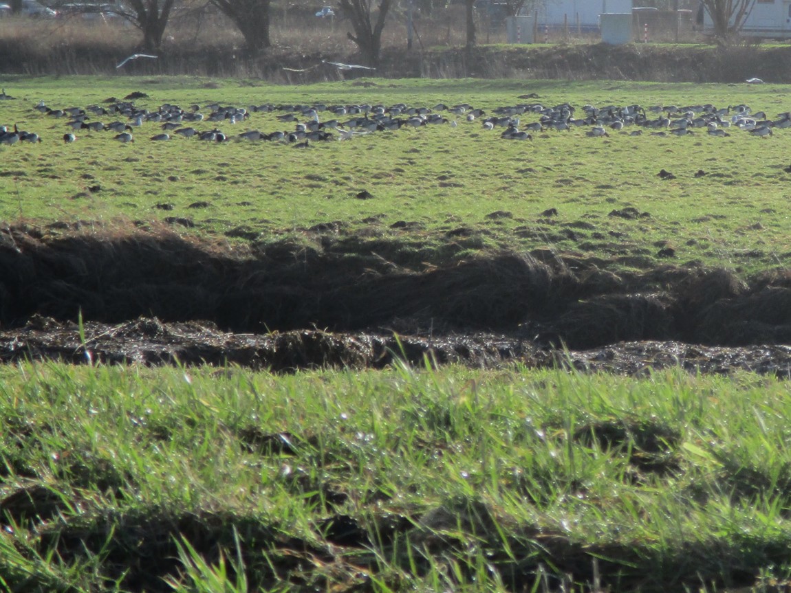 Da sitzt eine große Schar Nonnengänse (hier: der rechte Ausläufer) auf einem Marschwiesenstück zwischen Batavia und Feuerwehr. Über ihnen halten sich Möwen in der Luft, offenbar wird da Interessantes von den äsenden Gänsen aufgescheucht.