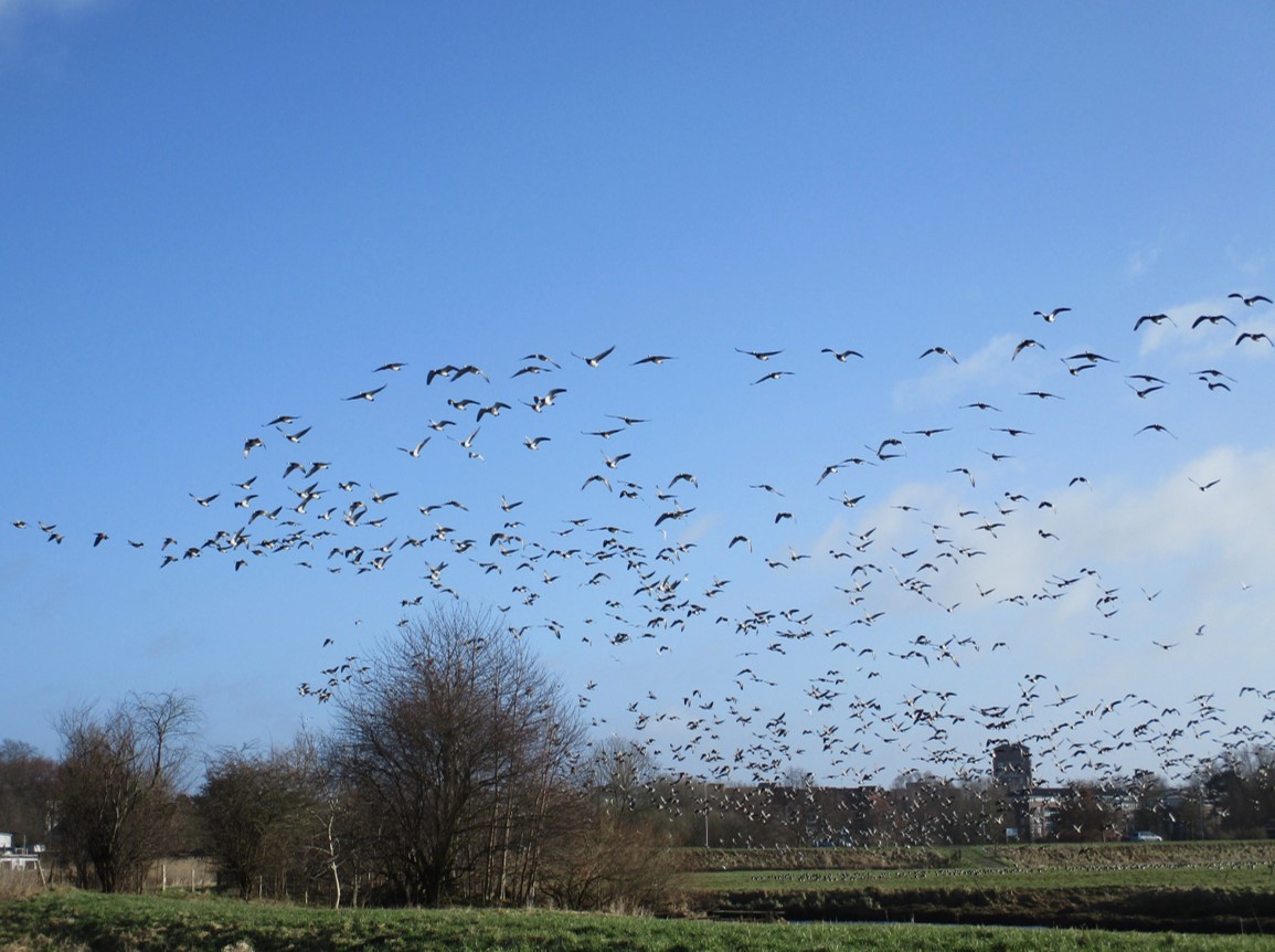 Während der größere Teil des Schwarms Richtung Sperrwerk Wedeler Au abfliegt, kehrt die Restgruppe an den Ausgangspunkt zurück.