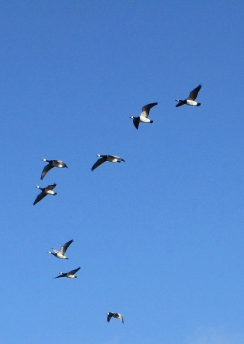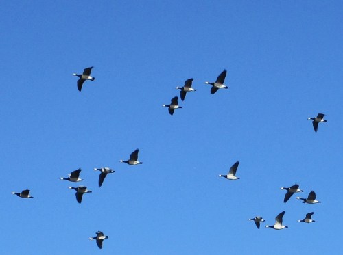Auf mich zu … – (hoffentlich lassen die im Flug nichts fallen – aber die Gänse unterscheiden sich von solchen wie Möwen).