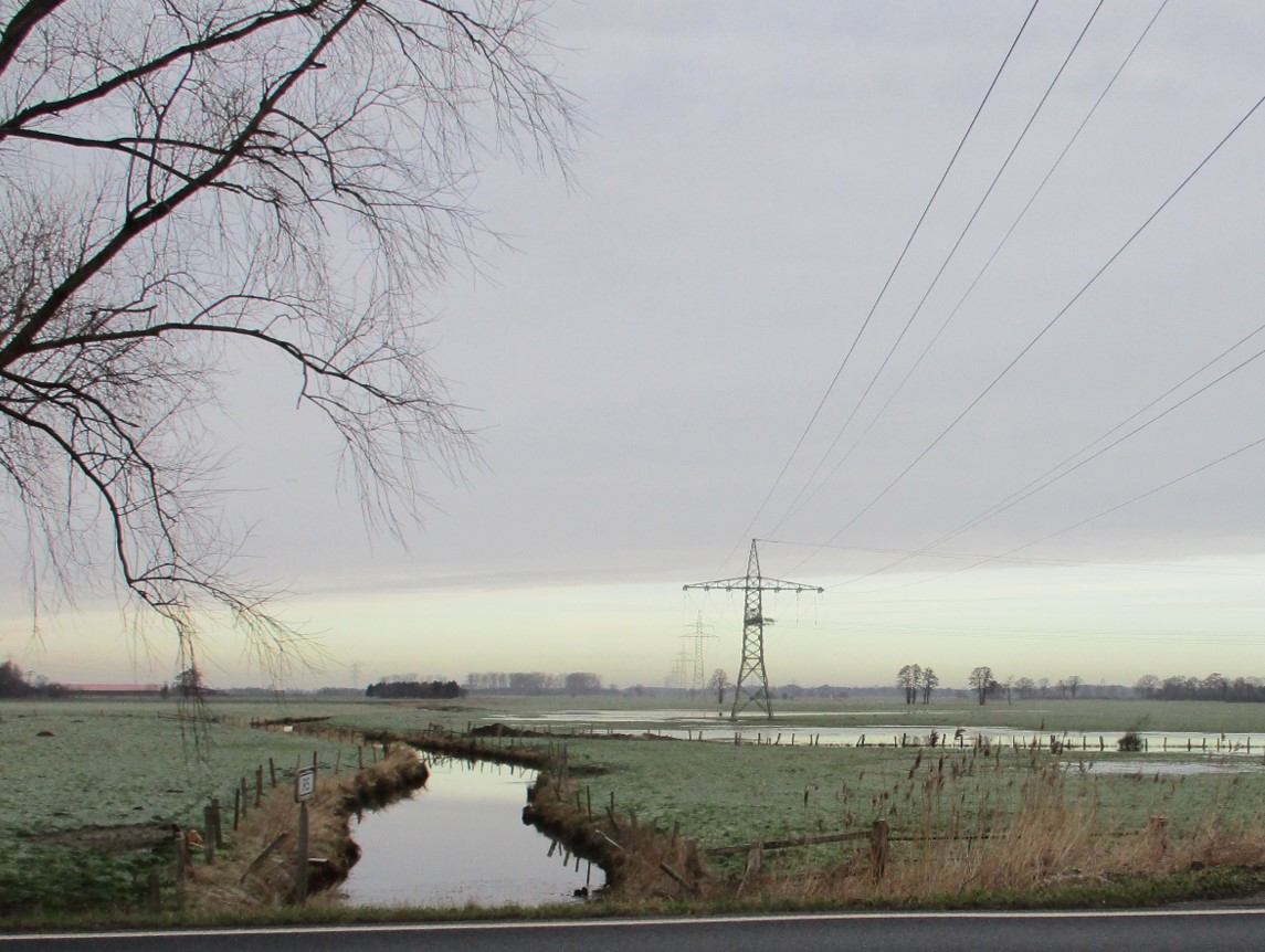 In der Marsch – ich radele Honig kaufen in Hetlingen. Entwässerungsgraben Lanner, ringsum alles nass.
