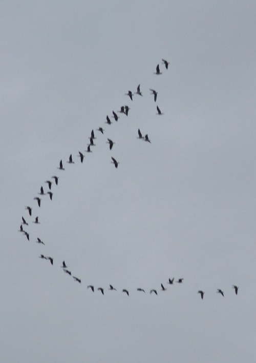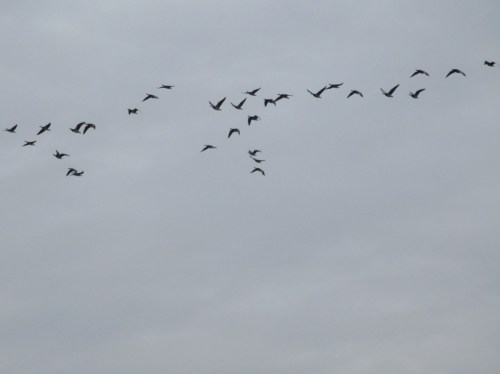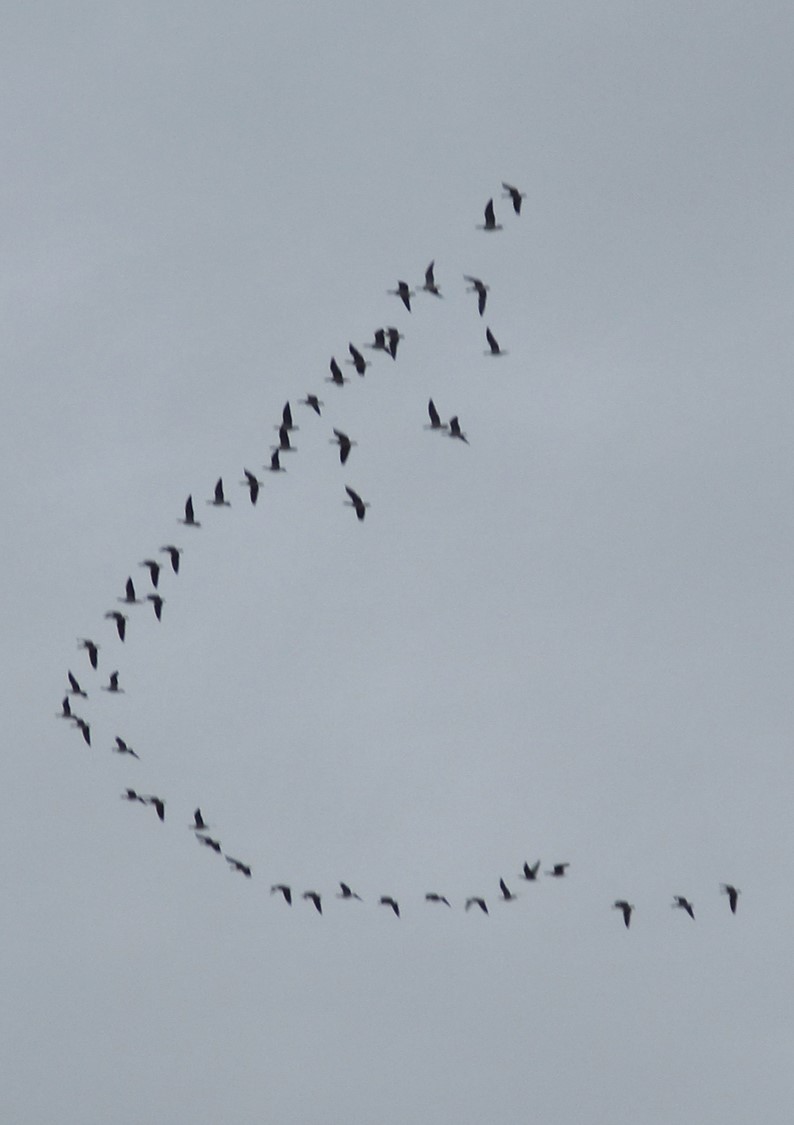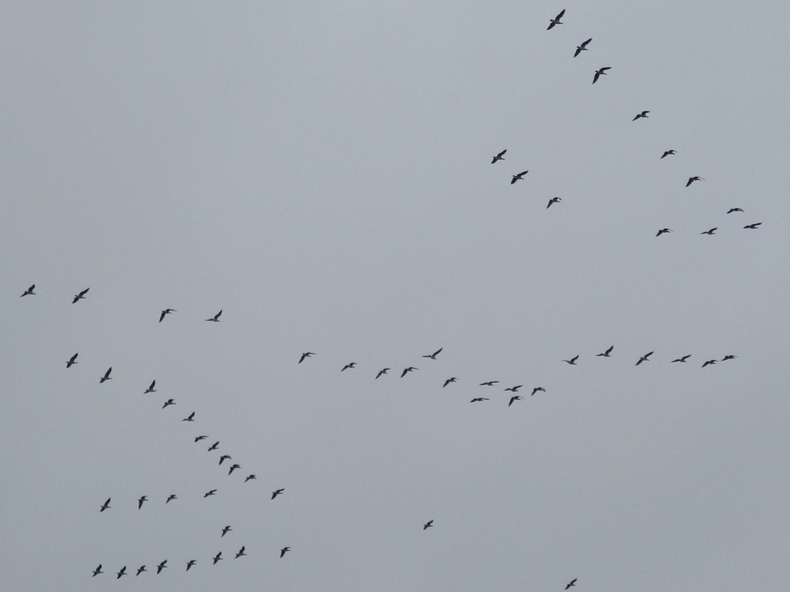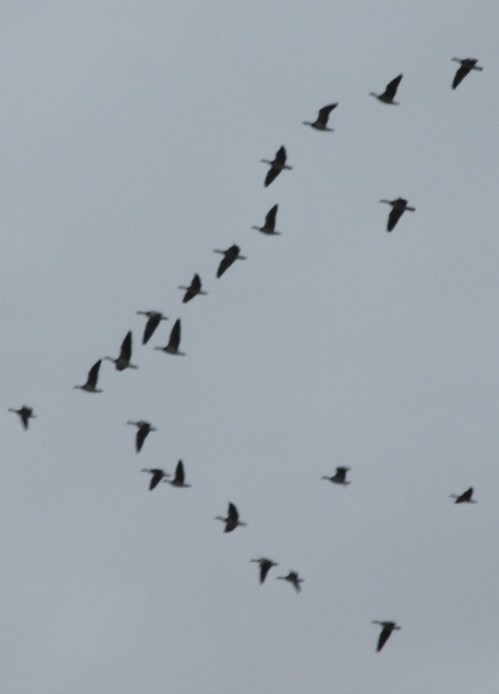 Mich überqueren, ungeordnet wirkend, in unterschiedlichen Ansätzen die V-Form anstrebend, Nonnengänse.