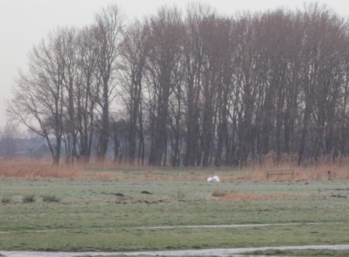 Detail – ein Schwanenpaar bewegt sich auf Wiesenflachsee (Flachseewiese?) vor der Erlengruppe rechts zwischen Wasser und Eisbedeckung.