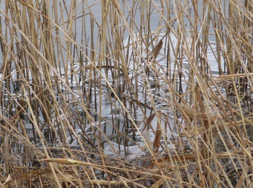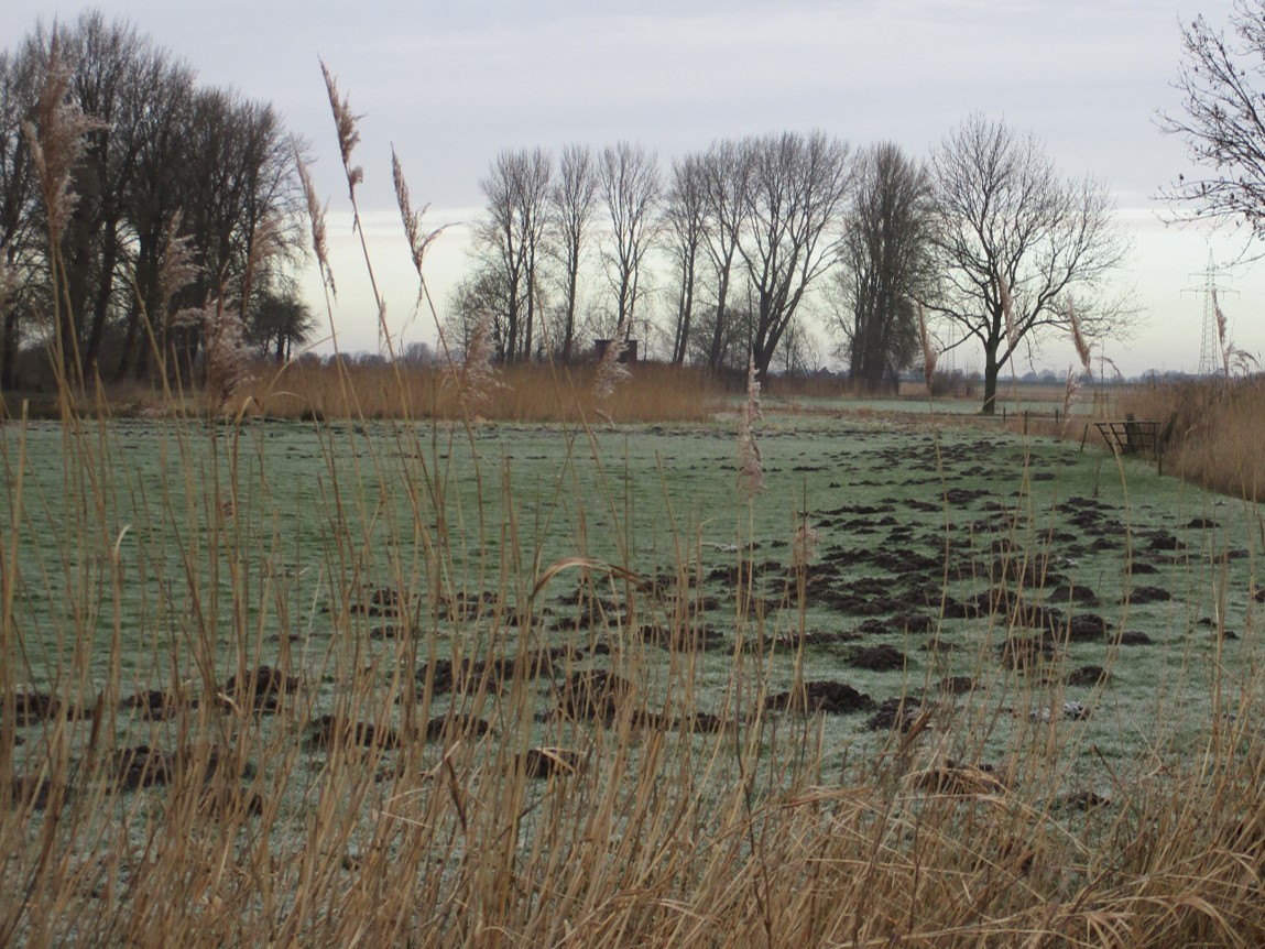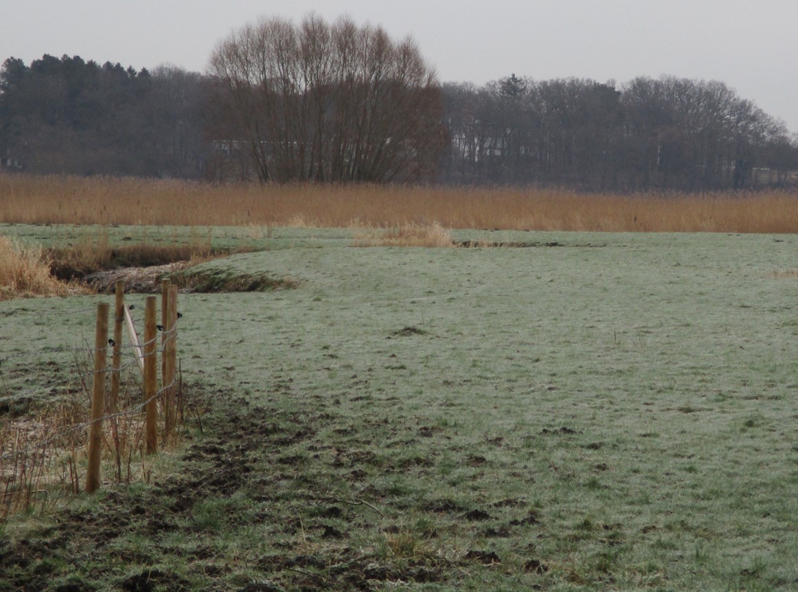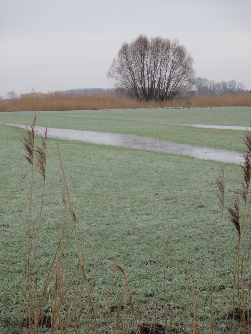 Weiter geradelt – dieselbe Weidengruppe Blick Marsch, Elbe, hinter Reet, raureifweisser Weide mit hoch eingestaut zugefrorenen „Grüppen“ (in diesem Fall ohne Abfluss).