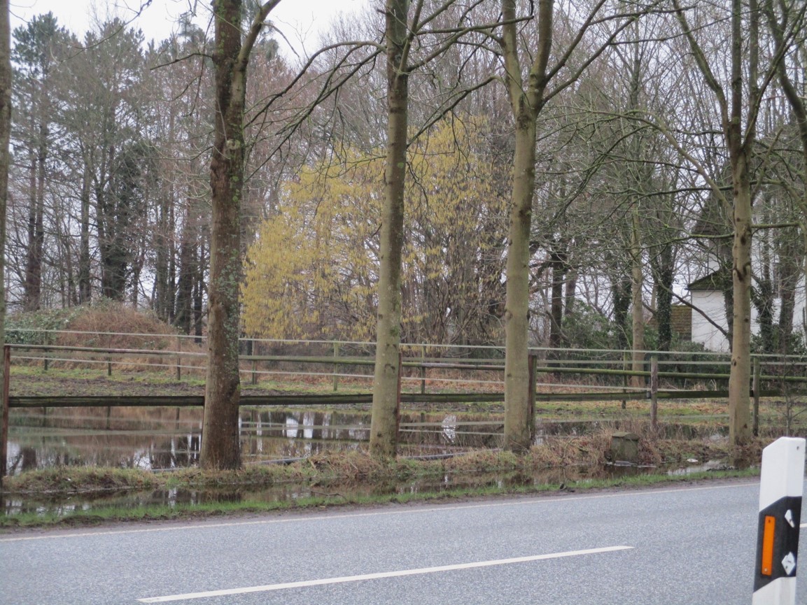 Und nochwas, Besonderes, ist auf dem Foto erkennbar. Offensichtlich ist Straßenüberwachung unfähig zur Grabenunterhaltung. Der Straßengraben läuft fast über, staut nachbarlich ein. Die Pferdewiese ist großflächig zu einem Flachsee geworden.