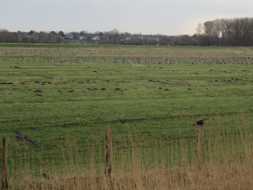 … landeten auf einer Marschwiese jenseits des Grabens am Deichfuß – die Fläche fürs Frühstück großräumig eingenommen von Nonnengänsen (in trockenen Partien eifrig aufgeworfen von den Grabowskis).