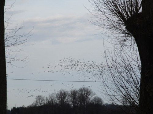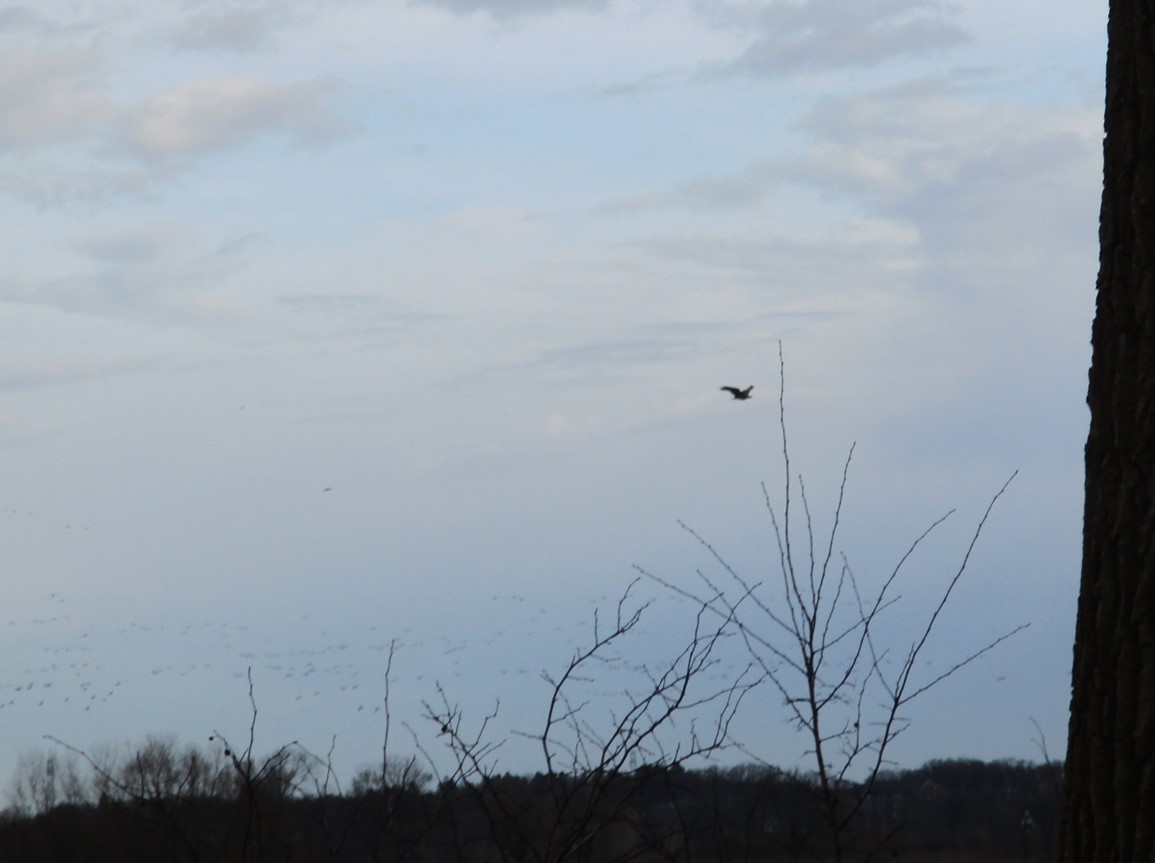 Dickes Huhn in der Luft, links unten die Nonnengänse – wie einige Tage zuvor bin ich offenbar unterwegs in einer Zeit, in der Seeadler ihren Standort wechseln.