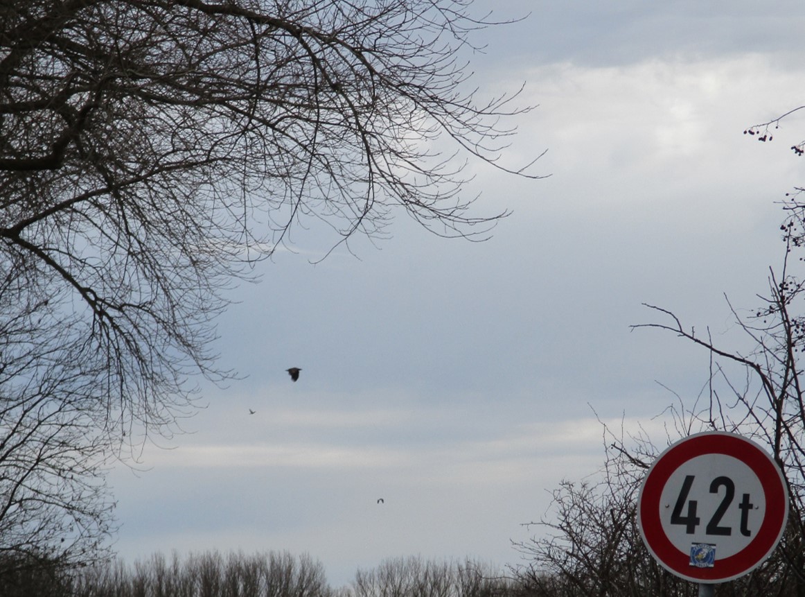 Der Seeadler quert die Pappeln am Langen Damm. Im Hintergrund zwei Silhouetten – ein weiterer Seeadler. „Der Dritte“ könnte auch ein Bussard sein.