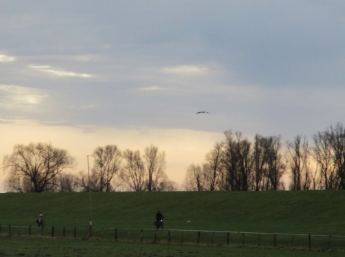 Die Zuordnung der beiden hinteren Großvögel muss offen bleiben, sie verschwinden hinter den Pappeln und Weiden des Brunnenschutzgebiets.