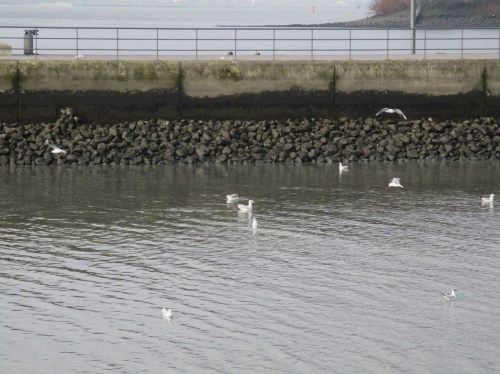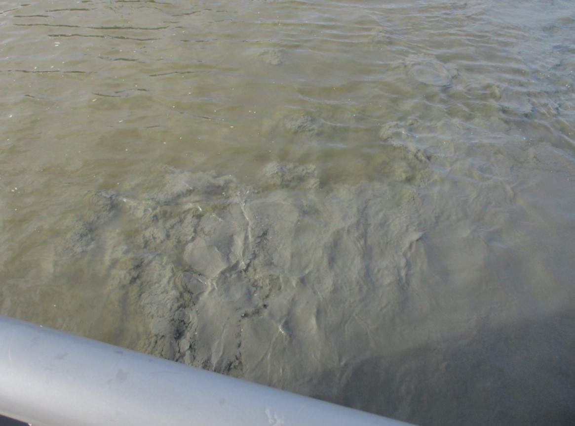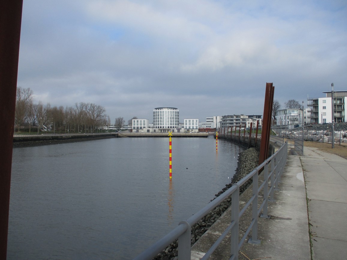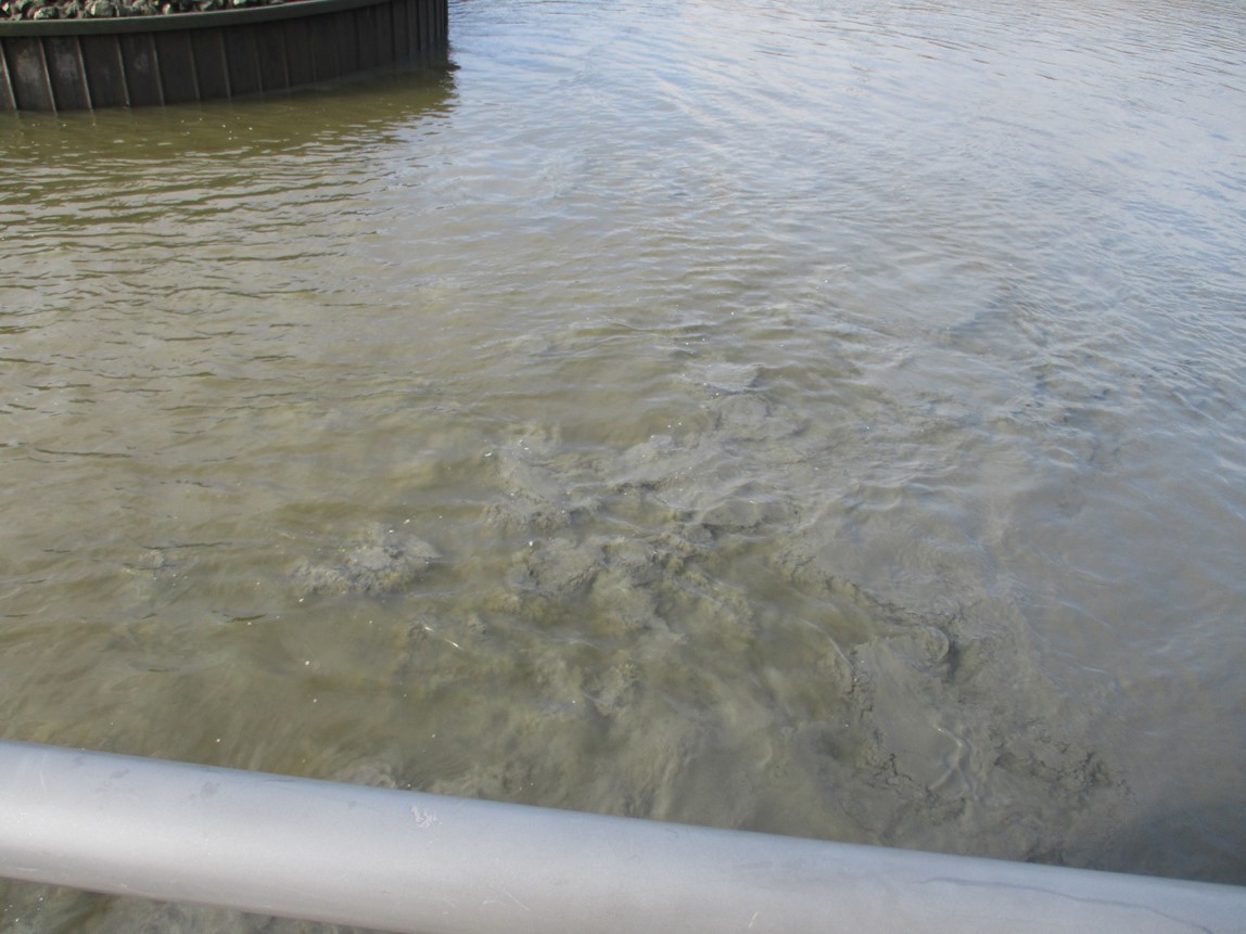 Richtung Hafenkopf prägt grautrübes, entmischtes Feinmaterial des Hafenschlicks mit reaktivierten Organikanteilen den Eindruck einer schlechten Wasserqualität.