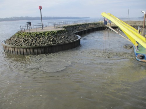 Dort, unmittelbar am Fahrwasser, geht das Material direkt in den Elbstrom (und landet – aus den Augen aus dem / diesem Sinn – anderswo …).