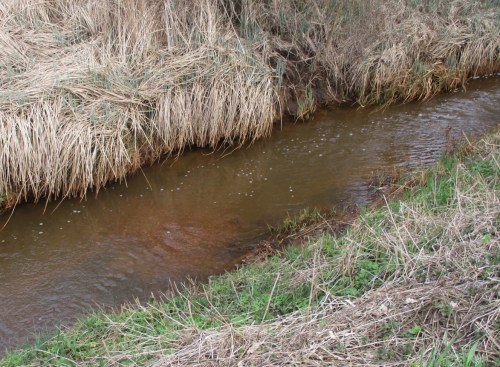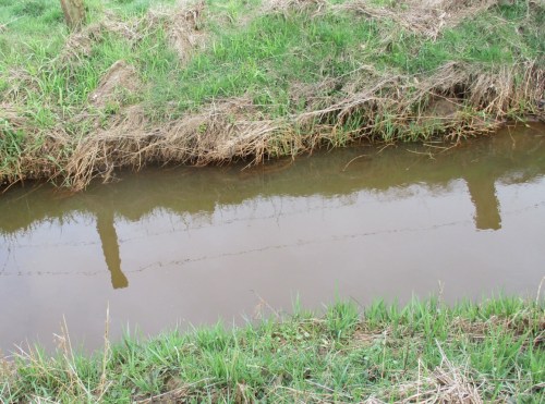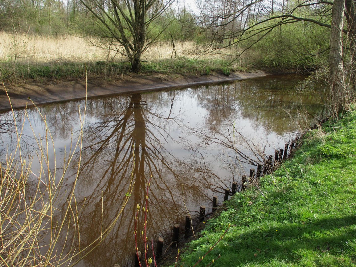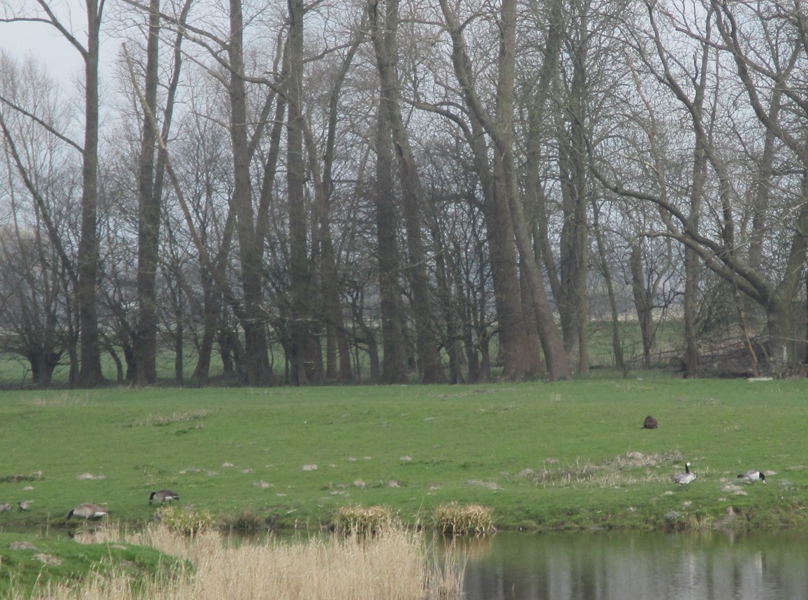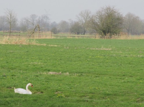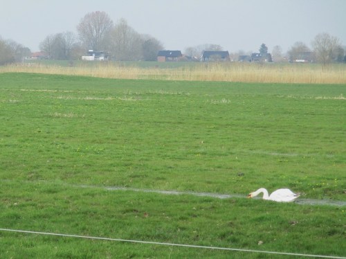 Nahebei sind die Kopfweiden fachgerecht zurückgeschnitten. – Ein Schwanenpaar quert – direkt hinter der unteren Leitung.