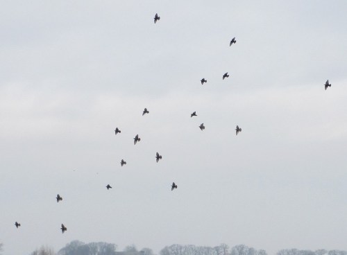 Irgendwie haben die Stare Gefallen gefunden, sich über den Nonnengänsen aufzuhalten. Werden da Insekten aufgescheucht? Fressen Stare überhaupt beim Fliegen?